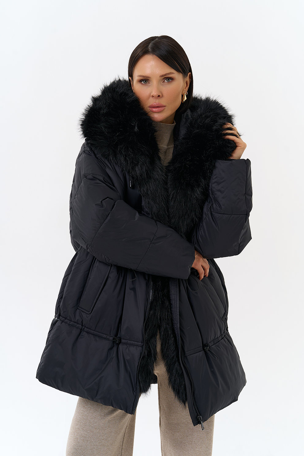Крой воротника - капюшон, отделка искусственный мех