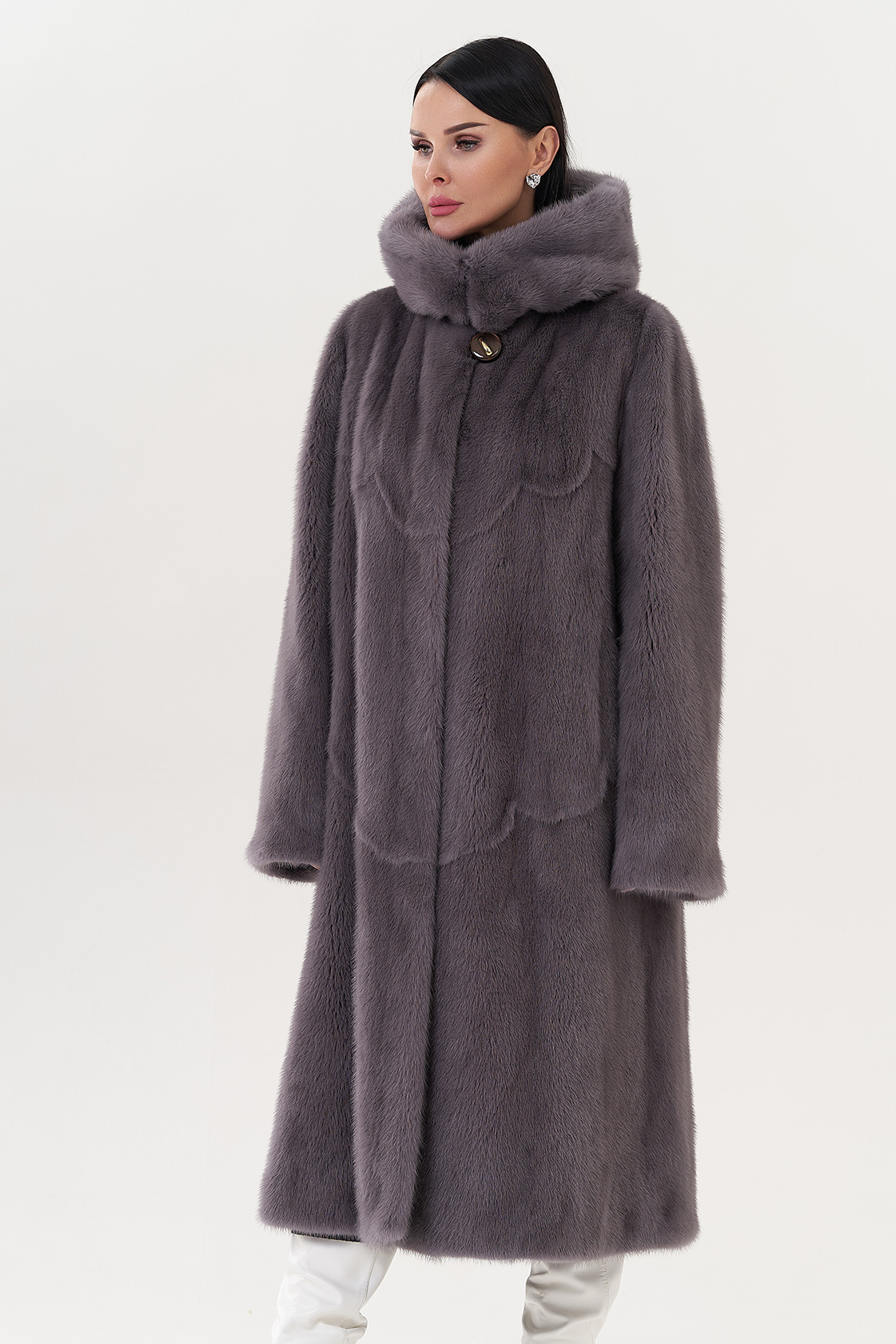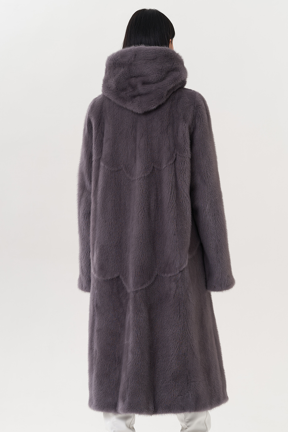 Норковая шуба с капюшоном в фиолетовом цвете.